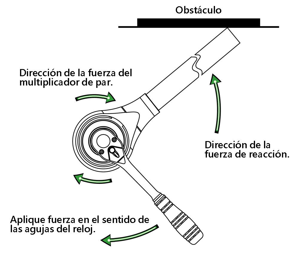 El cuadradillo de la llave, el multiplicador de torque y el objeto de apriete deben colocarse de acuerdo con el mismo eje posible y permanecer en la posición mientras se usa.