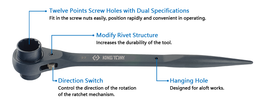 Correspond to the hexagonal screws. The ratchet mechanism assure that the screw can be tightened safely and trusty, and positioning repeatedly while working will not be necessary.