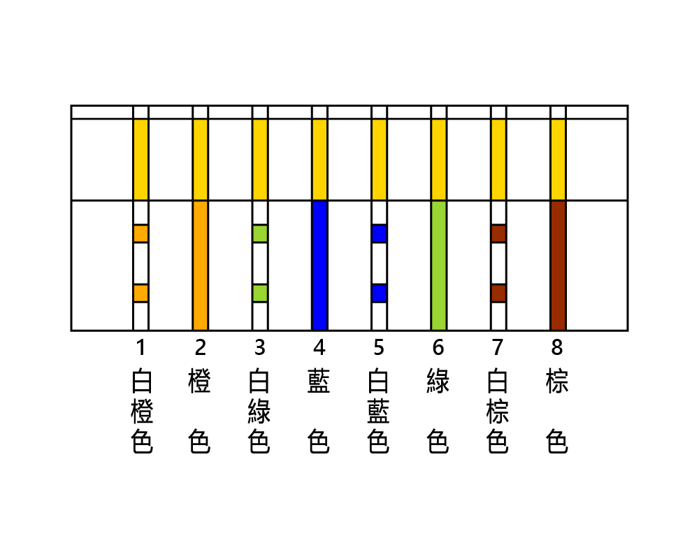 割開網路線外皮後,要整理網路接頭電線,依下列所示的顏色去排列。
